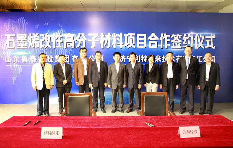 李合军在致辞时表示,石墨烯被称为未来新材料领域的"工业味精",石墨烯材料应用广泛、性能优异。鲁泰控股集团下属金威化工所生产的PVC是生产塑料的基础原料,在工程塑料、功能塑料开发及生产上与石墨烯有着众多的契合点,发展前景非常广阔。利特纳米公司拥有成熟的石墨烯制取技术和石墨烯新材料开发经验。鲁泰控股集团与利特纳米公司的这次合作,搭建了以石墨烯和聚氯乙烯为原料的新材料开发平台,实现了优势资源和先进技术的有机融合,不仅能够扩大石墨烯产业化应用,而且能够大幅度提升PVC产品附加值,有利于合作双方实现共赢、共同发展。协议签订后,我们将按照约定,与利特纳米公司共同加快推进石墨烯改性材料的开发,最终实现产业化应用,打造新的经济增长点,推动企业实现提质增效、转型升级,为济宁市地方经济发展做出新的贡献!